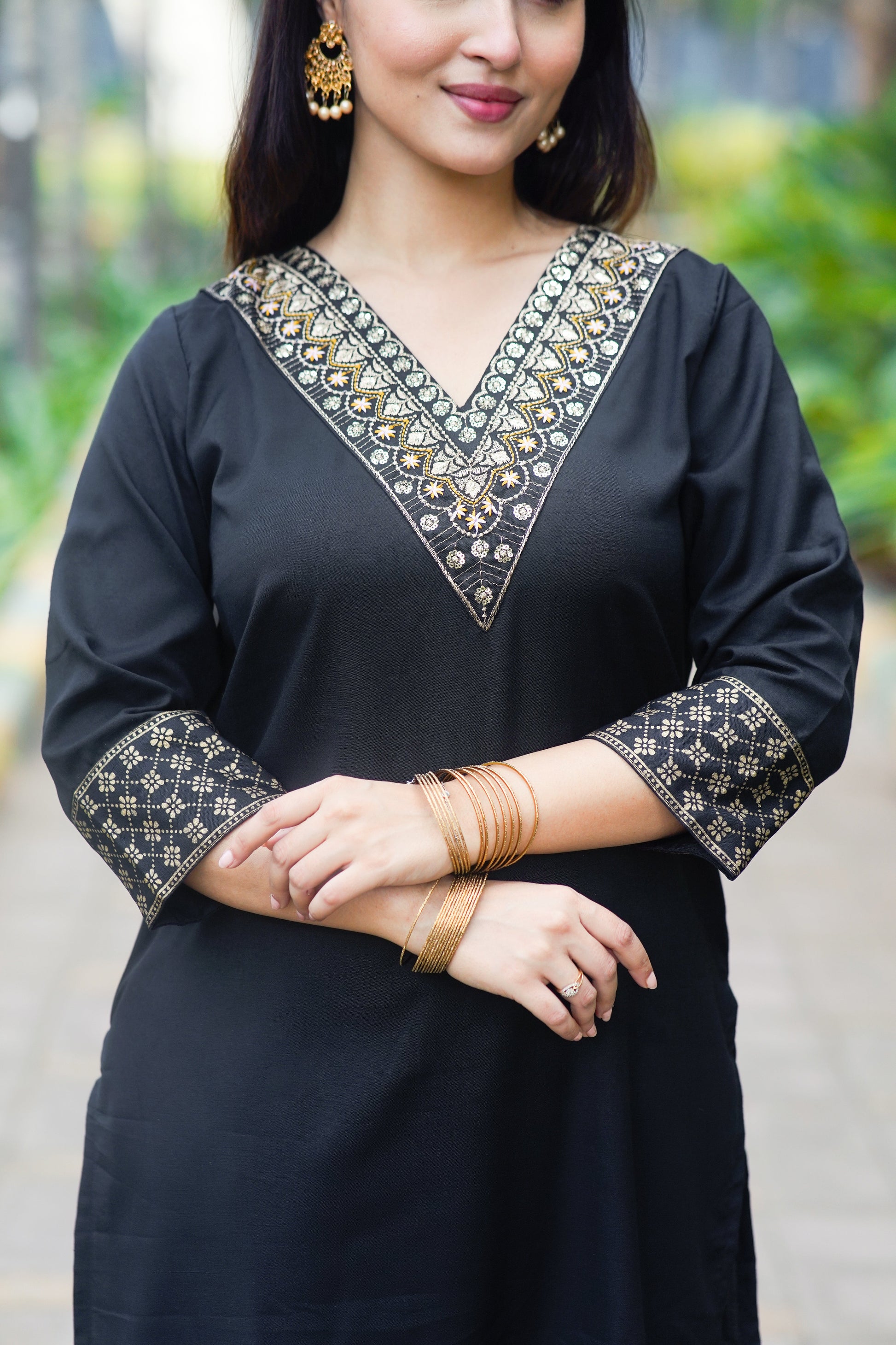 This black kurta set features intricate mirror work and luxe embroidered details, paired with a flowy floral organza dupatta — the perfect fusion of traditional and modern.