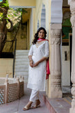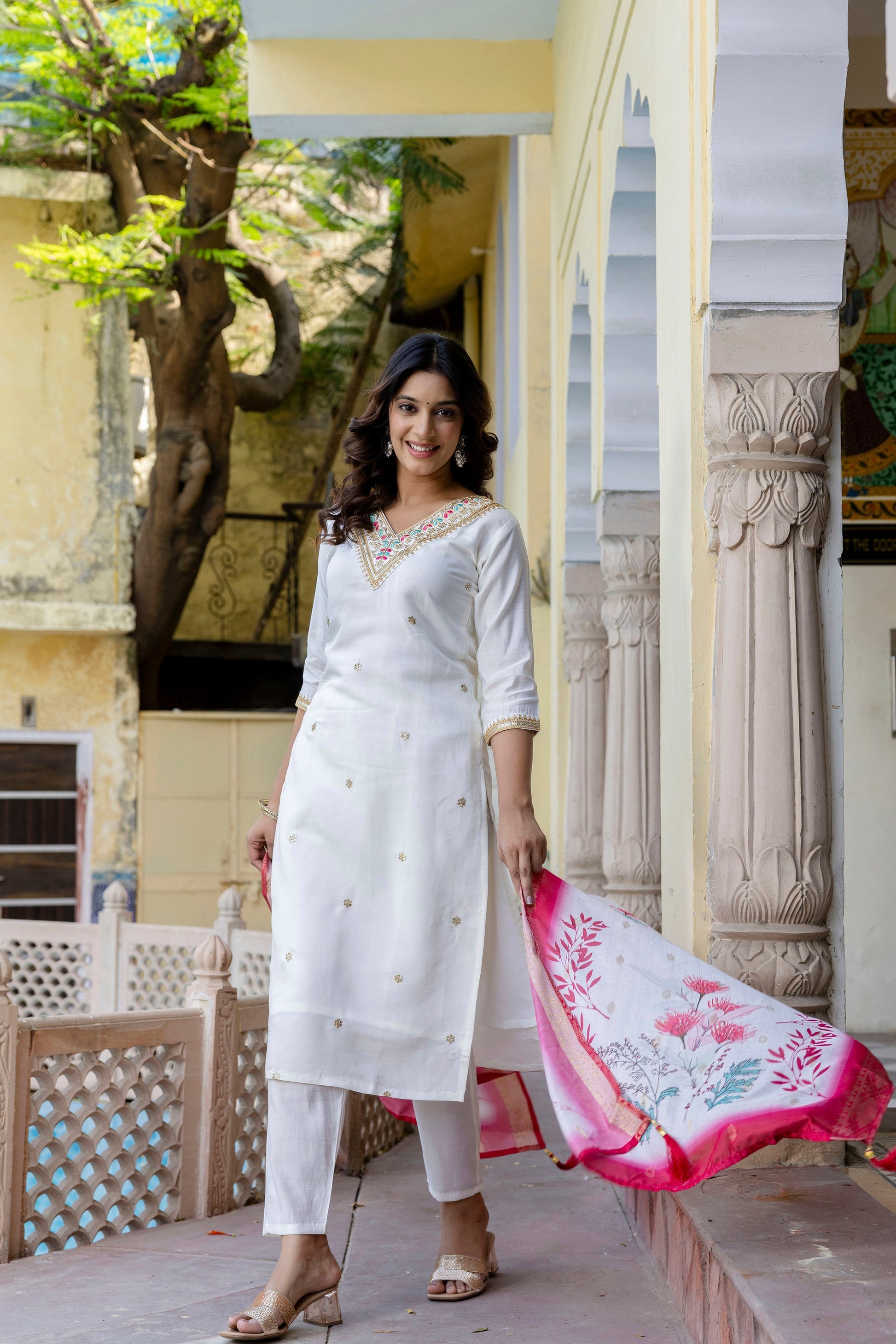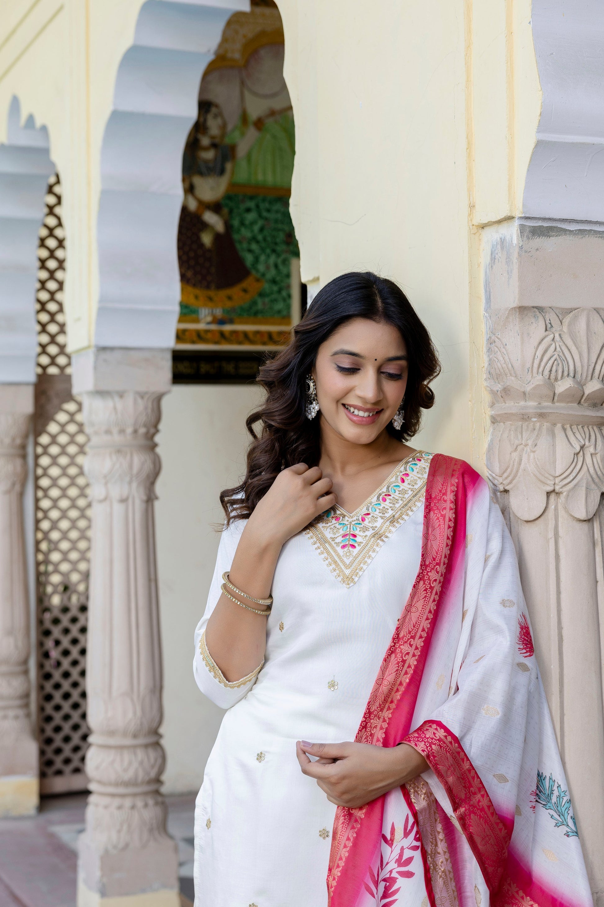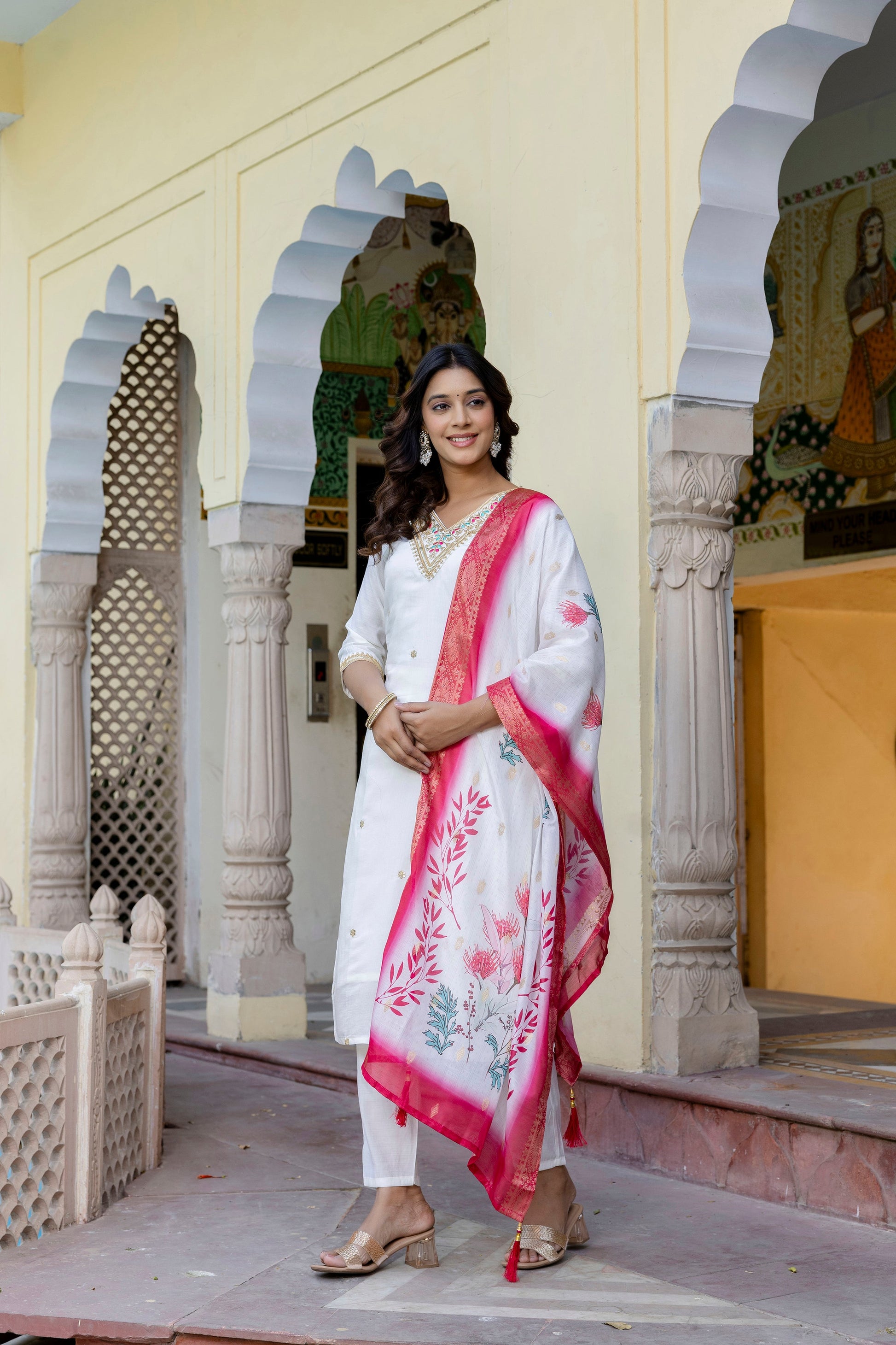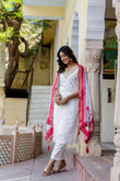 Elegant White Embroidered Suit Set with Pink Dupatta