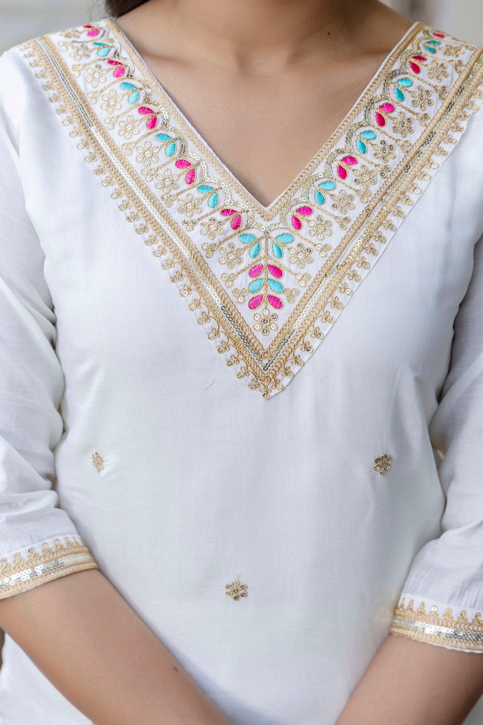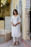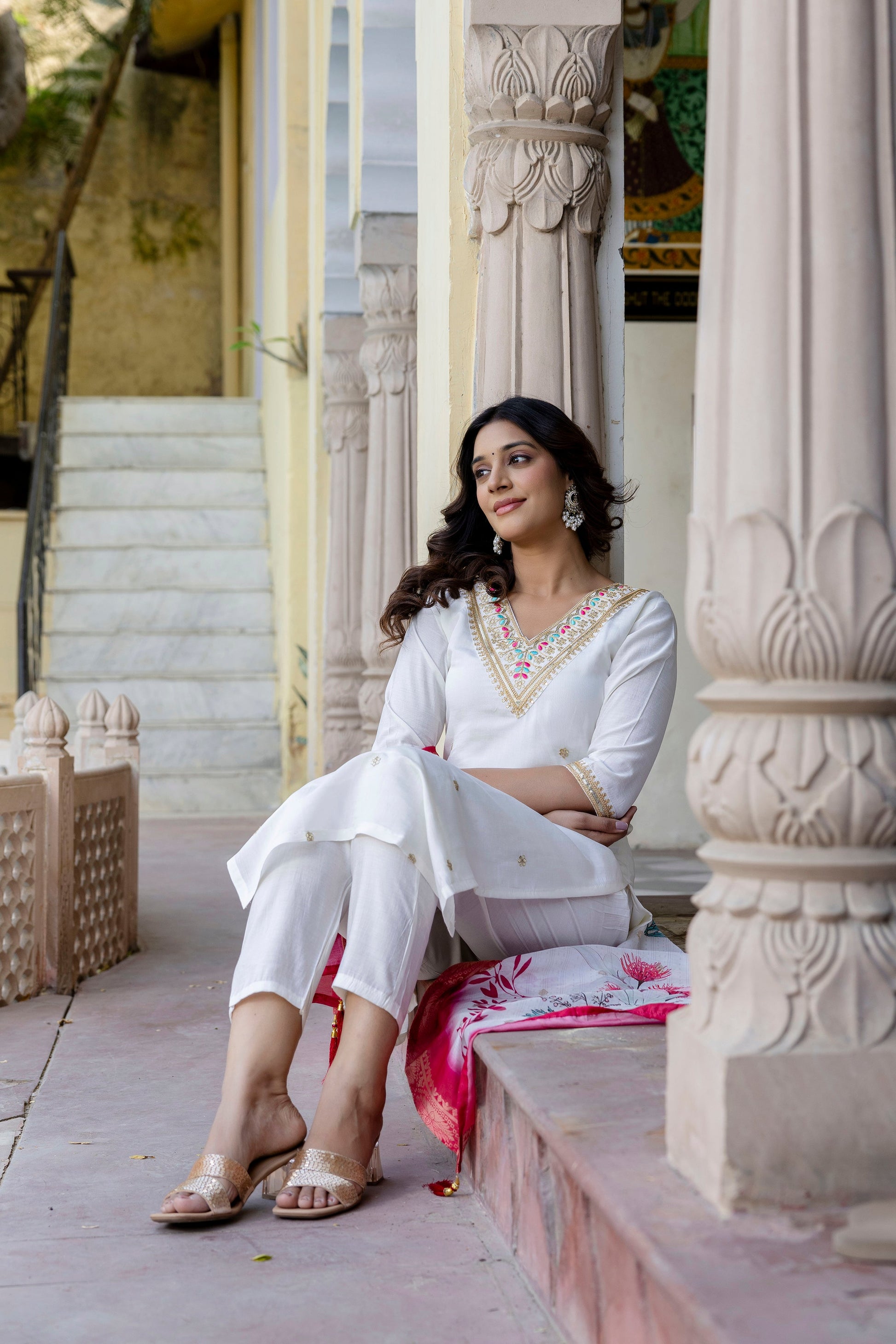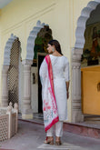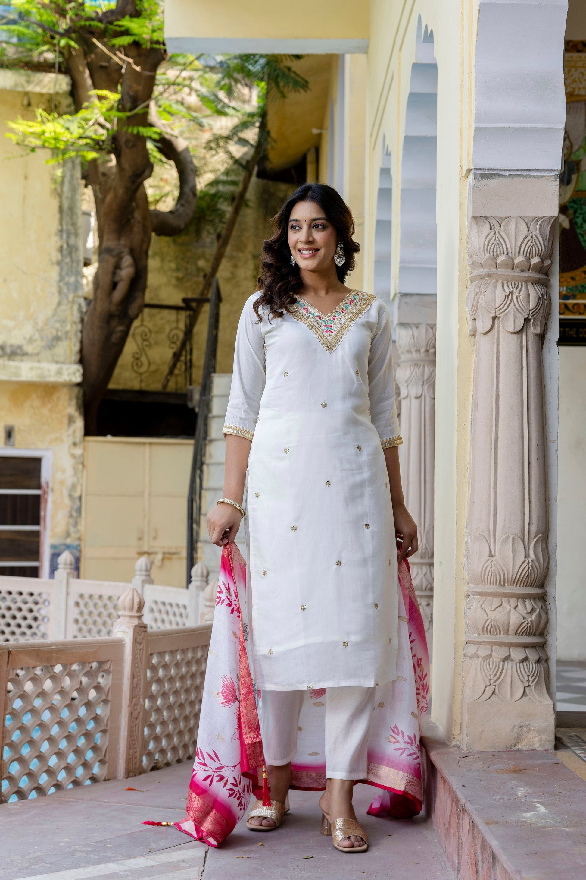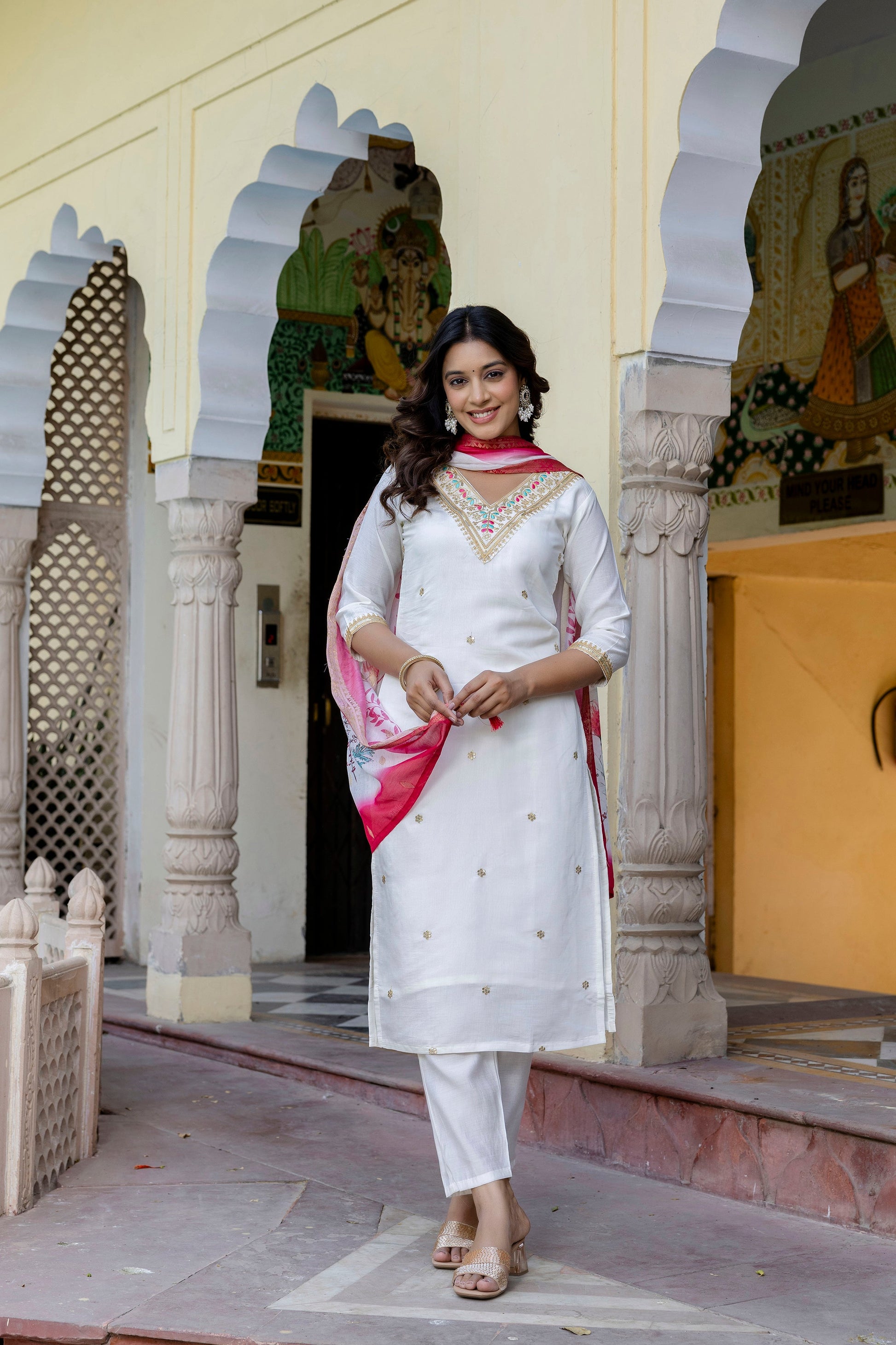 Elegant White Embroidered Suit Set with Pink Dupatta