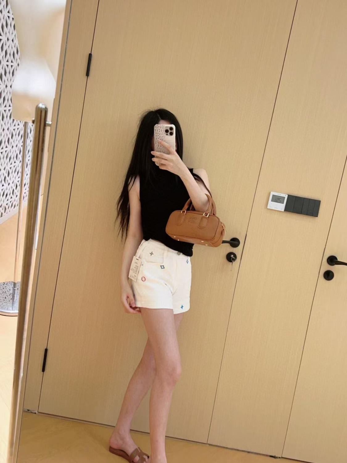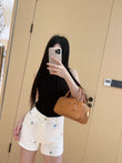 Elevate your summer wardrobe with these chic white denim shorts, adorned with signature monogram motifs in playful pops of red and blue. Perfect for casual outings with a touch of luxury flair.